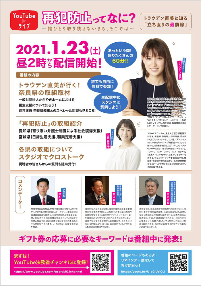 ニュース(令和3年) 【過去のニュースをご覧いただけます】 >>令和2年のニュースはこちら>>平成31年/令和元年のニュースはこちら>>平成30年のニュースはこちら>>平成29年のニュースはこちら トップぺージ 更生保護とは 更生保護の歴史 青森の更生保護 更生保護の組織 更生保護を支える人々 ニュース 青森県更生保護協会 青森県保護司会連合会 地区保護司会 青森県更生保護女性連盟 青森県BBS連盟 青森県協力雇用主会連盟 NPO法人青森県就労支援事業者機構 更生保護施設プラザあすなろ 自立準備ホーム 更生保護サポートセンター 法務省保護局公式X 青森保護観察所 更生保護ネットワーク