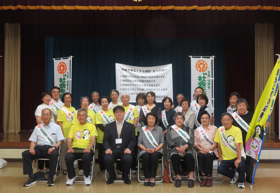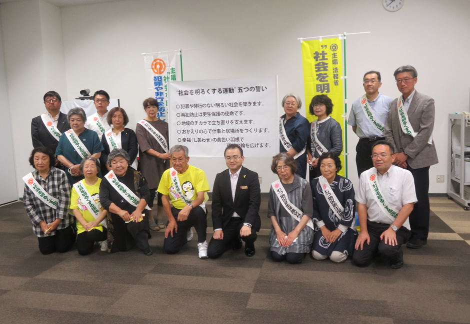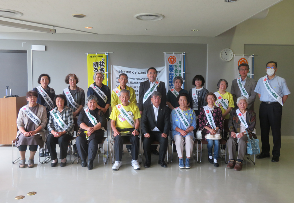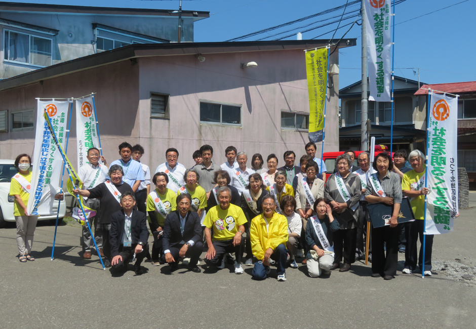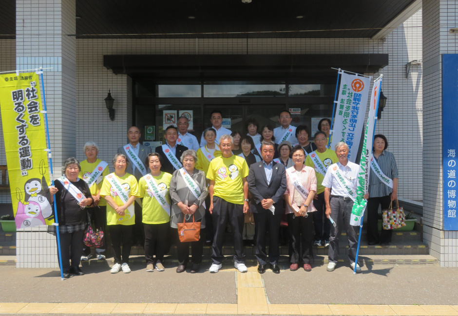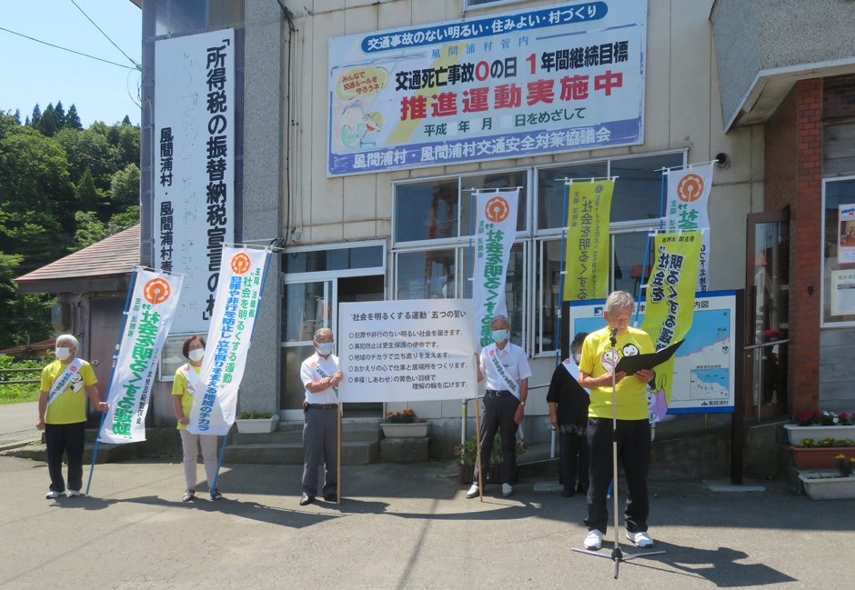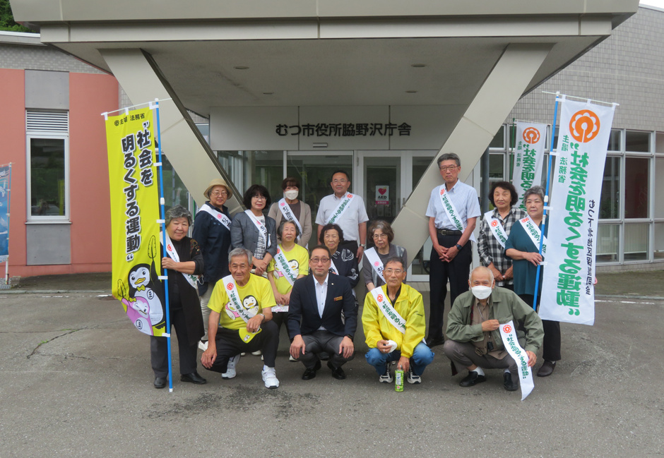 むつ市庁舎前で黙々と「社会を明るくする運動」の広報